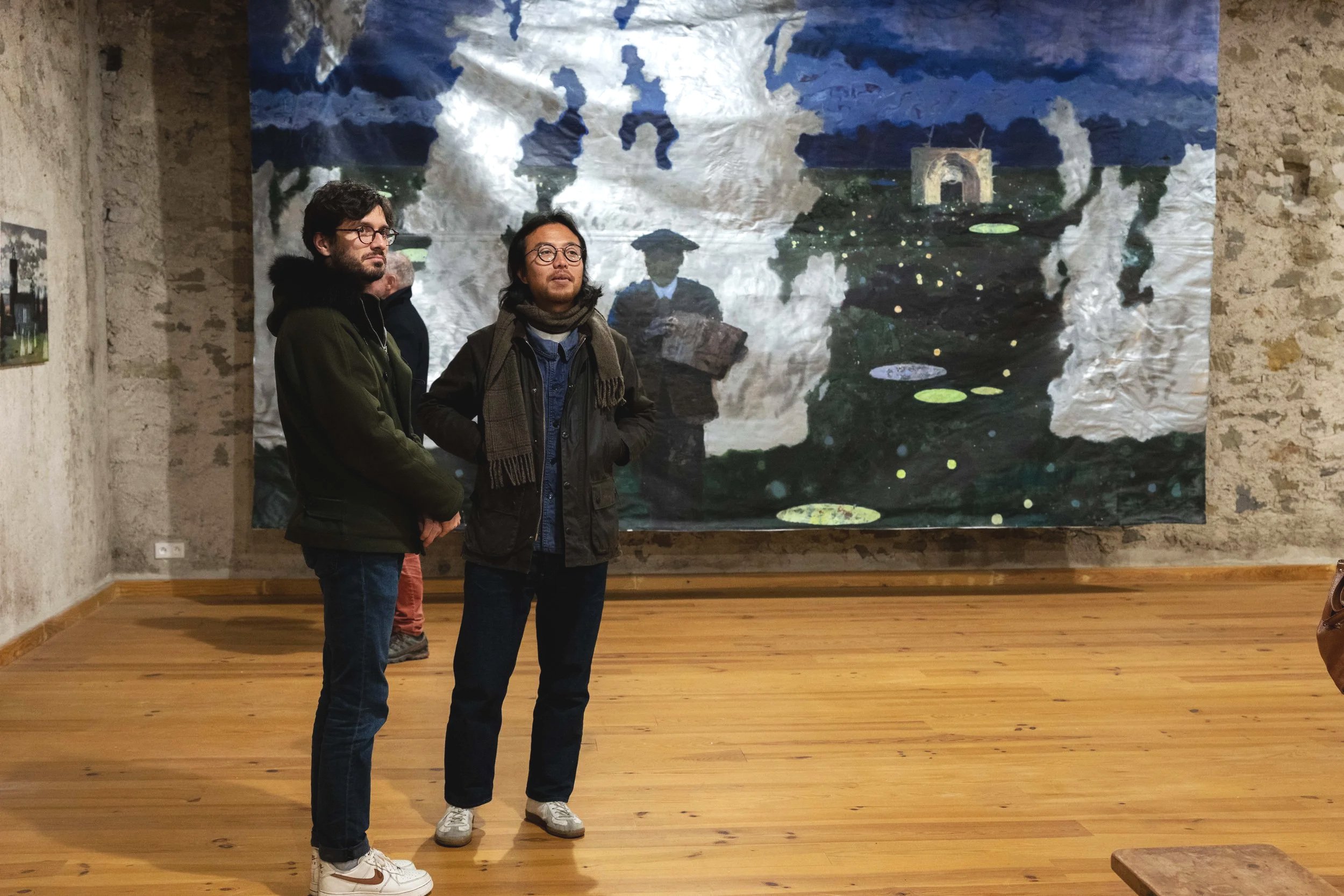 Dong Lyu (à droite) pendant l’exposition de fin de résidence à Maurac